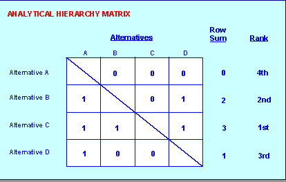 ![]() Thomas Saaty's Analytical Hierarchy Matrix.List alternatives in columns and rows as depicted in the matrix above. Starting with Alternative A, go across columns in the matrix and rate each alternative against all the others. |